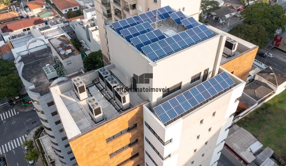 Colocaremos várias placas solares fotovoltaicas no topo do prédio para gerar energia limpa, ajudando na redução da conta do condomínio. Essas placas solares também são boas para o planeta, porque ajudam na redução de carbono na atmosfera.